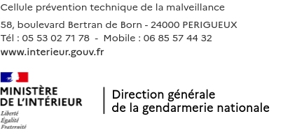 GENDARMERIE : il est important de savoir que la Gendarmerie Nationale et la Police Nationale ont développé des services de cybercriminalité. L'une des unités de la région est le service de cybercriminalite de la Gendarmerie de la Dordogne.
